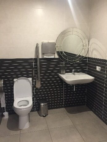 Firstly, there is a toilet at Casa Toni’s which is large enough to be accessible at the rear of the restaurant. However, disabled access to the toilet in the restaurant, could be challenging for an independent wheelchair user. For instant, the gradient of the ramp-up to the disabled toilet could cause necessary problems. For an independent wheelchair user,  it will be a struggle to stop on the ramp and then open the door. Therefore, some wheelchair users may require assistance getting into the toilet which is a shame as the accessible toilet is well proportioned and immaculately clean.